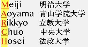 如今正值陽(yáng)春三月,而三月的英文單詞正是MARCH,小編今天就來(lái)給大家介紹一下在日本關(guān)東區(qū)內(nèi)僅次于最難關(guān)私立大學(xué)群【早慶上理ICU】的關(guān)東中堅(jiān)私立大學(xué)群-MARCH:明治大學(xué)、青山學(xué)院大學(xué)、立教大學(xué)、中央大學(xué)、法政大學(xué)五所大學(xué)。MARCH這個(gè)名字,最早是由日本雜志《螢雪時(shí)代》的主編代田恭之提出的。由于日本大學(xué)的合格發(fā)布時(shí)間大多數(shù)都在每年的三月,而MARCH又是這五所人氣名校的日文羅馬音首字母的合寫(xiě),因此索性就使用三月的英文單詞來(lái)作為它們的昵稱(chēng)。(圖:MARCH為對(duì)應(yīng)名校名稱(chēng)縮寫(xiě))由這五所大學(xué)組成的關(guān)東中堅(jiān)私